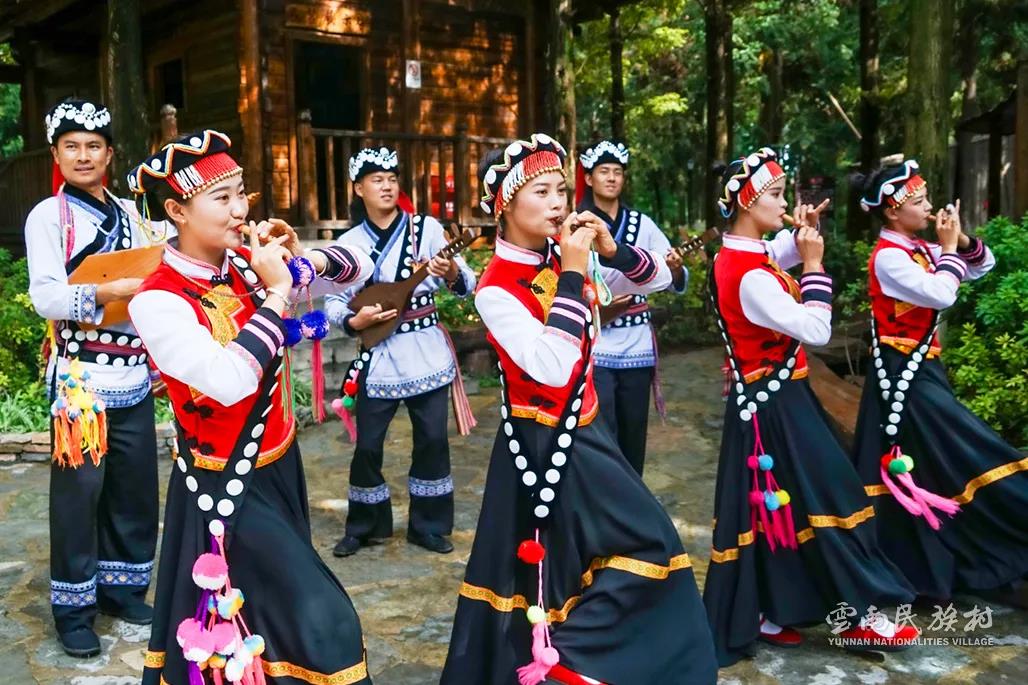 彝族在云南境內(nèi)約471萬人,是省內(nèi)人口最多、分布最廣的少數(shù)民族,主要聚居在金沙江、元江流域和哀牢山、無量山腹地。彝族是一個(gè)能歌善舞的民族,民間打歌、跳樂之風(fēng)盛行,大三弦、跌腳舞久負(fù)盛名。火把節(jié)是彝族最具特色的民族節(jié)日。彝族村占地50余畝,三虎浮雕墻與虎頭內(nèi)祖師形象表現(xiàn)了彝族虎鷹文化。太陽歷廣場(chǎng)圖騰柱上有太陽、虎、火和八卦圖形象,周圍環(huán)繞著10個(gè)朝向不同的月球造型,外圓周有12生肖石雕。依山而建的“...